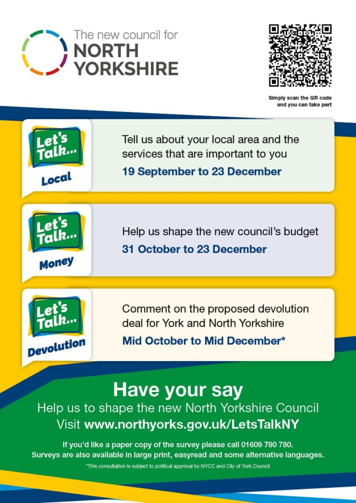 On 1 April 2023, North Yorkshire Council will replace the eight councils currently delivering public services in North Yorkshire. NYCC are kick-starting North Yorkshire’s biggest countywide conversation, Let’s Talk, this autumn to understand how the public are feeling, what their priorities for their local areas are and to get their feedback to help inform decision-making for the new North Yorkshire Council.