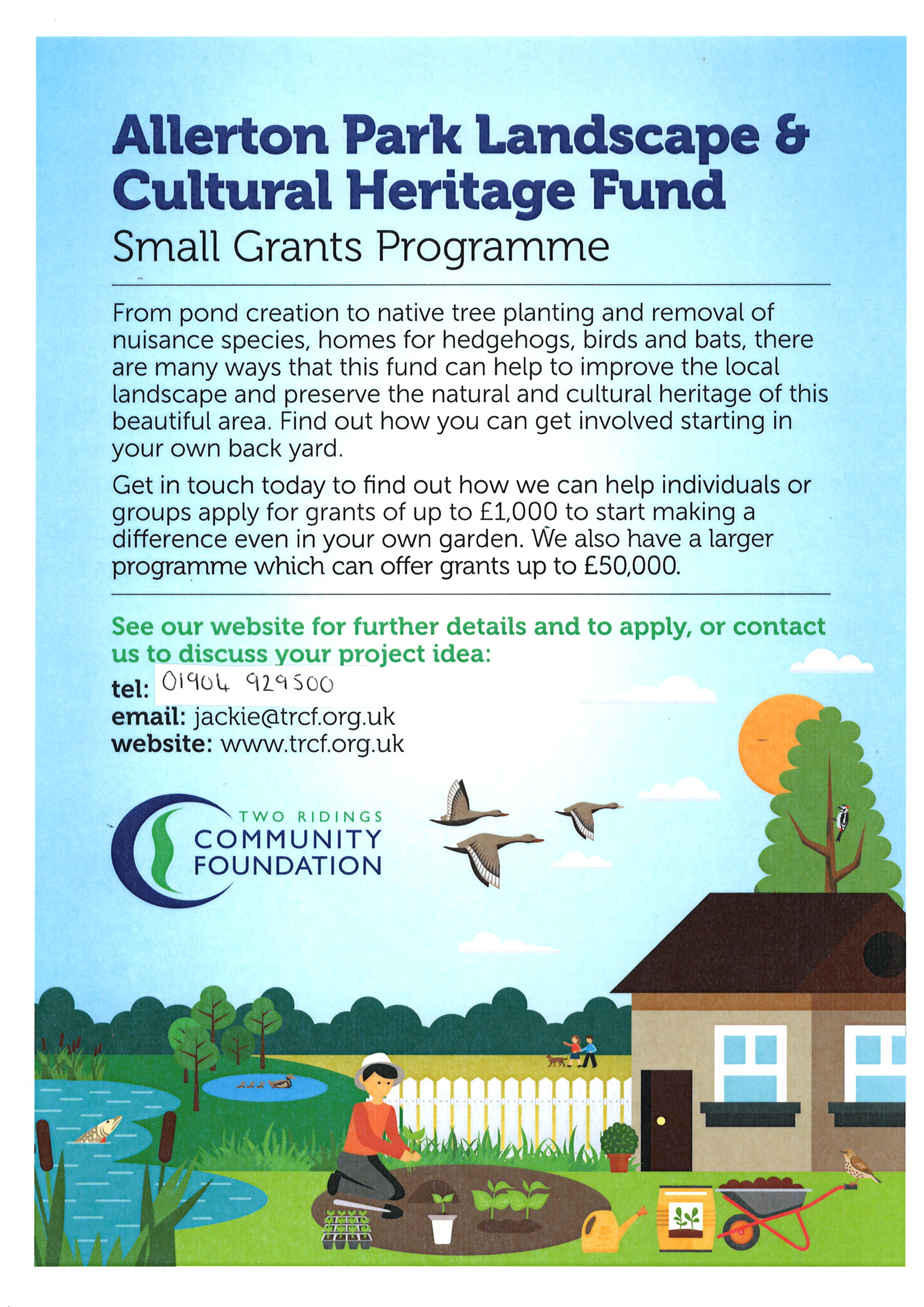 Grants of up to £1,000 are still available from the Allerton Park Landscape and Cultural Heritage Fund for individuals within the benefit area of the fund scheme. See below for further details.