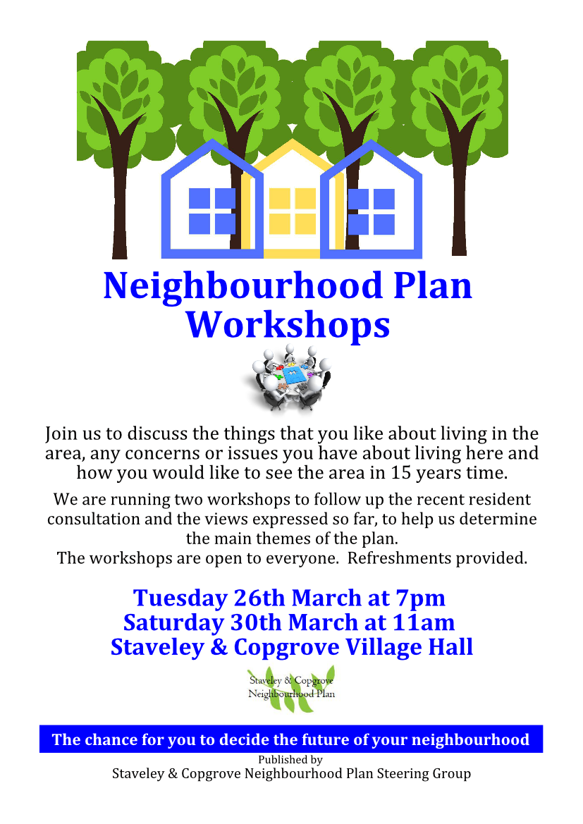 Continuing the initial community consultation exercise to identify the main themes to be considered for the Neighbourhood Plan, the Steering Group are running two workshops later this month …