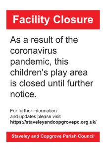 Following the latest Government instructions, we have closed the children’s play area in the Jubilee Recreation Field on Arkendale Road, Staveley until further notice.
