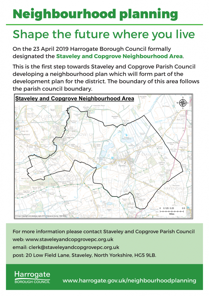 At a meeting on 23rd April 2019, Harrogate Borough Council (HBC) approved the Parish Council’s application for designation of the Staveley and Copgrove Neighbourhood Plan. The proposed plan area of both Copgrove and Staveley civil parishes was approved along with the Parish Council’s statement of suitability for the plan production.